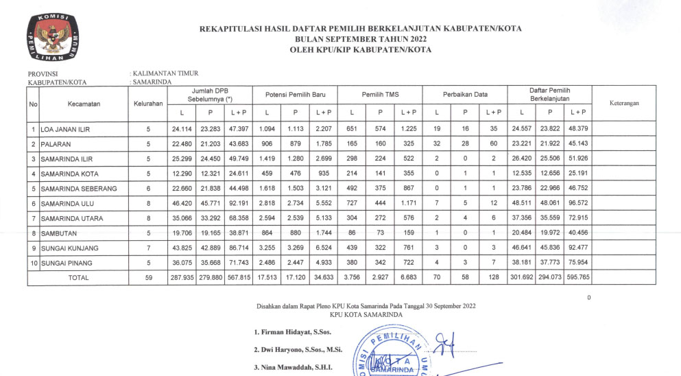 Berdasarkan daftar pemilih berkelanjutan yang dihitung KPU Samarinda, pada September 2022, ada sekitar 140.274 pemilih di Dapil 2, tersebar di 16 kelurahan. Rinciannya di Palaran ada 5 kelurahan dengan jumlah pemilih sementara 45.143, di Samarinda Seberang , jumlah pemilih sementara ada 46.752 tersebar di 6 kelurahan. Sedangkan jumlah pemilih sementara di Loa Janan Ilir ada 48.379 tersebar di 5 kelurahan.