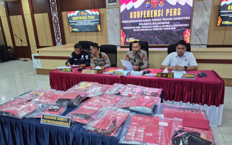 BALIKPAPAN.NIAGA.ASIA – Upaya pemberantasan narkotika di Kota Balikpapan terus digencarkan. Dalam kurun Januari hingga Februari 2026, Polresta Balikpapan mengungkap puluhan kasus narkoba, dengan nilai barang bukti hingga miliaran rupiah.