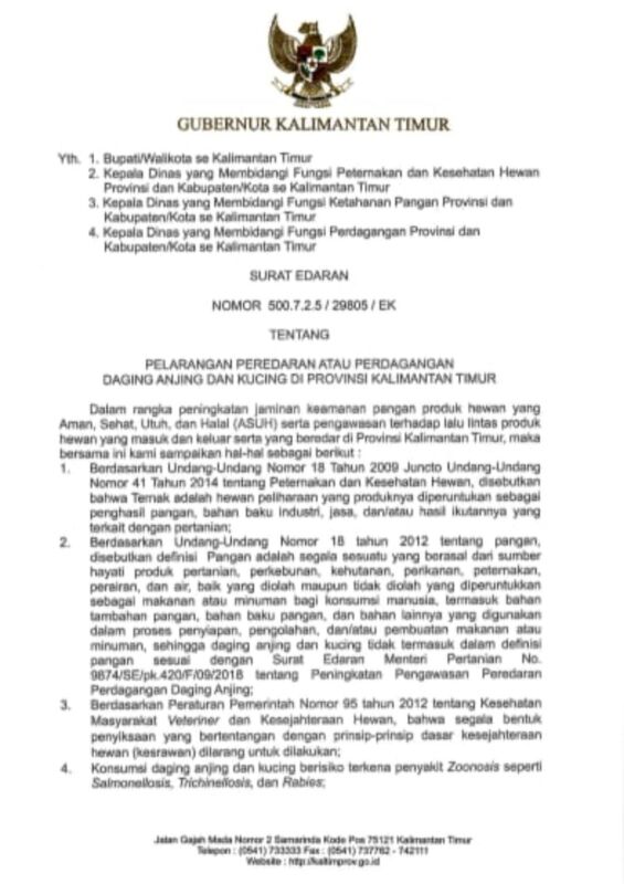 SAMARINDA.NIAGA.ASIA –.Pemprov Kaltim resmi menerbitkan Surat Edaran Gubernur tentang Pelarangan Peredaran atau Perdagangan Daging Anjing dan Kucing di daerah, menyusul adanya temuan indikasi virus rabies pada sampel hewan di titik pengepulan, yang memicu kekhawatiran akan ancaman kesehatan masyarakat.