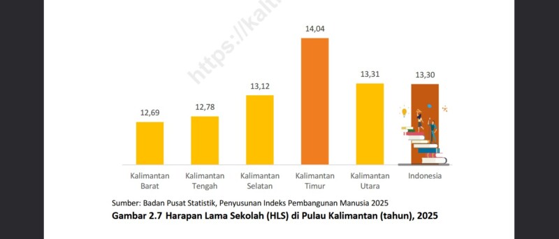 Indikator berikutnya yang mewakili dimensi pengetahuan yaitu harapan lama sekolah (HLS) dan rata-rata lama sekolah (RLS). Di Pulau Kalimantan, Provinsi Kalimantan Timur menjadi satu-satunya provinsi dengan angka HLS yang sudah mencapai 14 tahun, tepatnya 14,04 tahun atau setara dengan tamat pendidikan jenjang Diploma II (D-II).