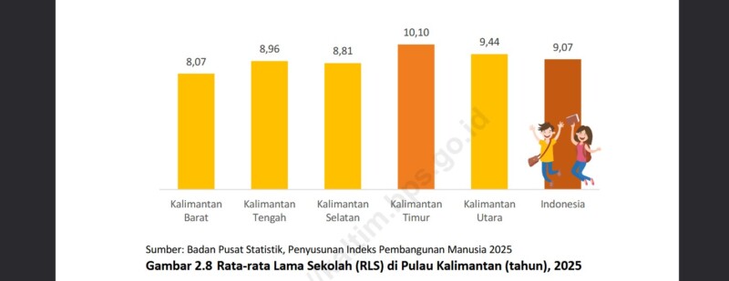 “Adapun Provinsi Kalimantan Utara adalah provinsi selanjutnya yang memiliki RLS di atas 9 tahun yaitu sebesar 9,44 tahun, setara dengan tamat pendidikan SMP. Sementara itu, provinsi Kalimantan Barat, Kalimantan Tengah, dan Kalimantan Selatan masih berada di kisaran 8 tahun. Untuk capaian di level nasional sendiri, saat ini masih berada pada kisaran 9 tahun, tepatnya 9,07 tahun,” demikian BPS Kaltim.