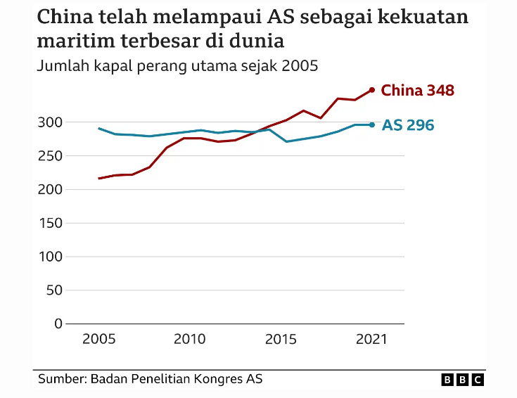 China telah menyusul AS menjadi angkatan laut terbesar di dunia – tetapi para ahli menunjukkan bahwa perbandingan sederhana dari jumlah kapal mengabaikan banyak faktor yang menentukan kemampuan angkatan lautnya.
