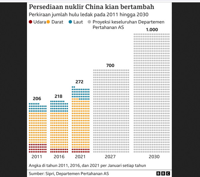 Jumlah yang dimiliki China masih jauh dari persediaan AS sebesar 5.550 hulu ledak, tetapi pembangunan nuklirnya dipandang sebagai salah satu ancaman terbesar bagi supremasi militer Barat.