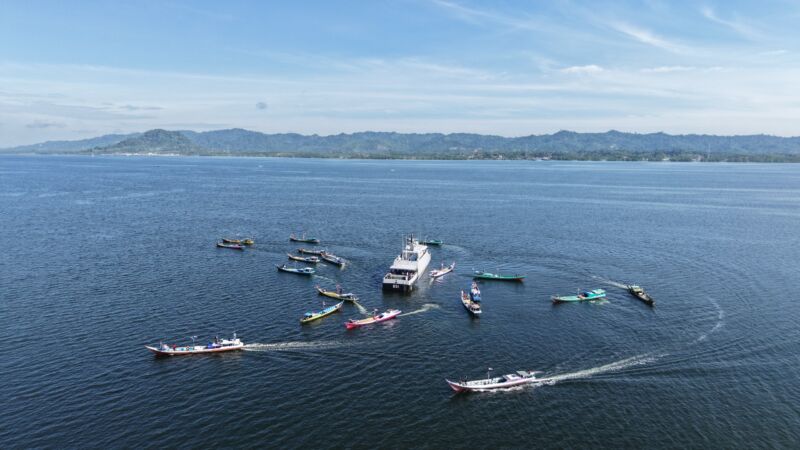 Upaara peringatan Dharma Samudera tahun 2026 ditutup dengan penyerahan paket bantuan sembako kepada puluhan nelayan yang sejak pagi hingga siang bersiaga mengelilingi KRI Sidat – 851.