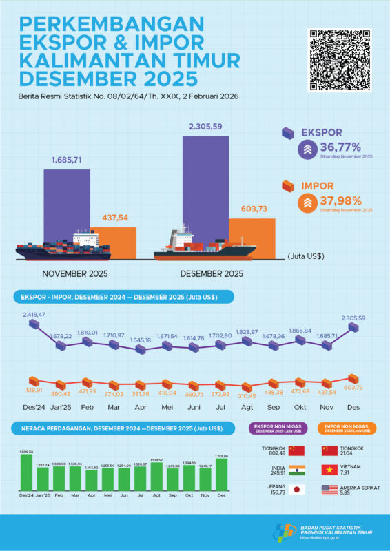 Neraca perdagangan Provinsi Kalimantan Timur pada Desember 2025 mengalami surplus sebesar US$1.701,86 juta. Neraca perdagangan sektor nonmigas tercatat surplus sebesar US$1.964,41 juta, sebaliknya sektor migas tercatat defisit sebesar US$262,55 juta.