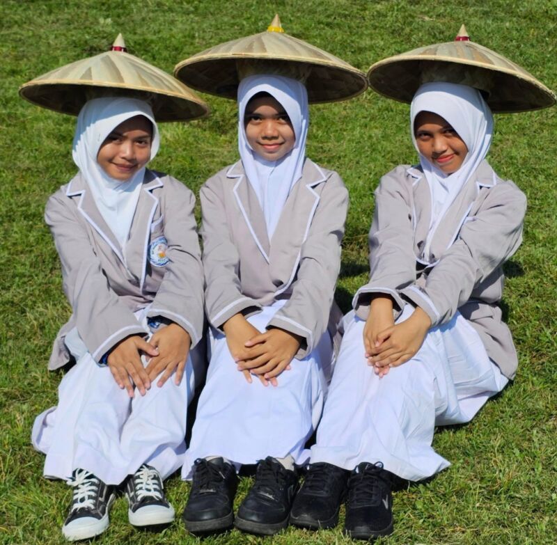 Nur Annisa Ahla (8C); Alifa Khairunnisa (8B); dan Jia Mei Sari (8C) mengenakan topi Sahung, kerajinan khas Kenohan yang menjadi tema film dokumenter mereka. (Niaga.Asia/Lydia Apriliani)