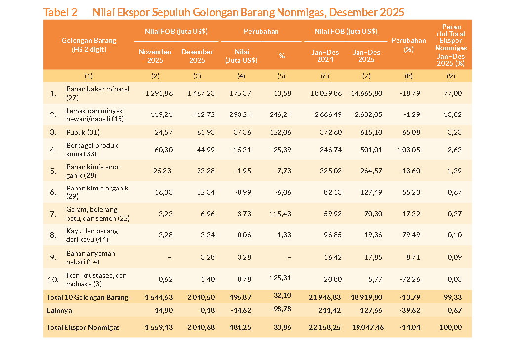 “Selama Januari–Desember 2025, ekspor dari 10 golongan barang (HS 2 digit) memberikan kontribusi 99,33 persen terhadap total ekspor nonmigas. Golongan barang yang memberikan andil terbesar terhadap total ekspor nonmigas adalah golongan barang bahan bakar mineral dengan kontribusi sebesar 77,00 persen,” kata Ariyanti.