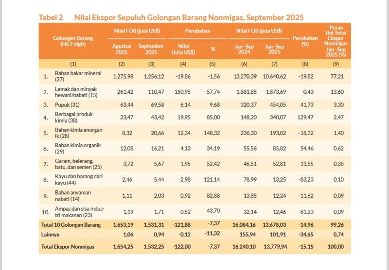 “Selama Januari–September 2025, ekspor dari 10 golongan barang (HS 2 digit) memberikan kontribusi 99,26 persen terhadap total ekspor nonmigas. Golongan barang yang memberikan andil terbesar terhadap total ekspor nonmigas adalah golongan barang bahan bakar mineral dengan kontribusi sebesar 77,21 persen,” kata Yusniar.