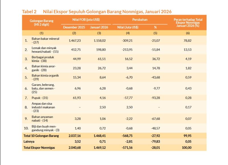 Sebaliknya, lanjut Mas’ud, komoditas lain yang mengalami penurunan nilai ekspor adalah golongan barang lemak dan minyak hewani/nabati yang turun sebesar US$213,95 juta (51,84 persen) dan golongan barang pupuk sebesar US$57,77 juta (93,28 persen). Pada Januari 2026, ekspor dari 10 golongan barang (HS 2 digit) memberikan kontribusi 99,95 persen terhadap total ekspor nonmigas.