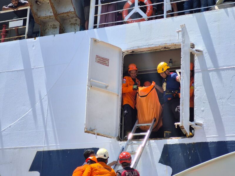 BALIKPAPAN.NIAGA.ASIA — Proses evakuasi korban di atas Kapal Motor (KM) Dharma Kartika IX yang miring saat sandar di Pelabuhan Semayang, Balikpapan, berlangsung dramatis dan memakan waktu berjam-jam.