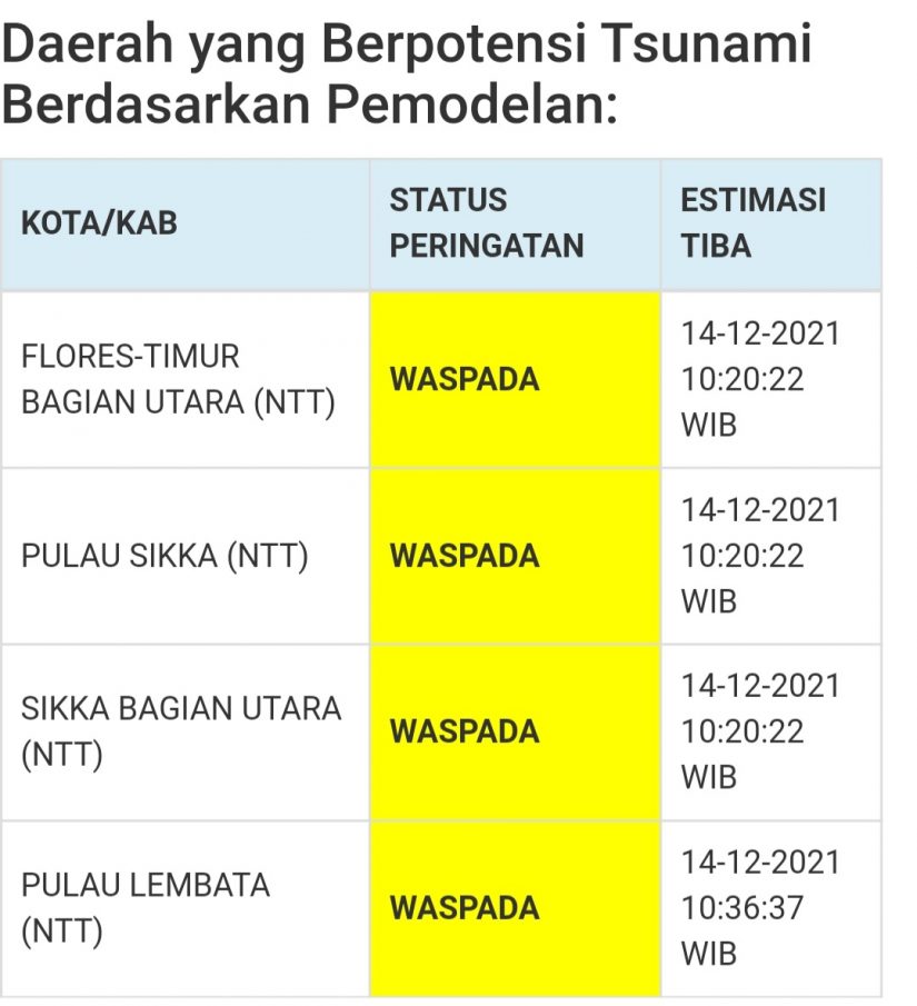 BMKG juga memperingatkan potensi tsunami di empat daerah di NTT :