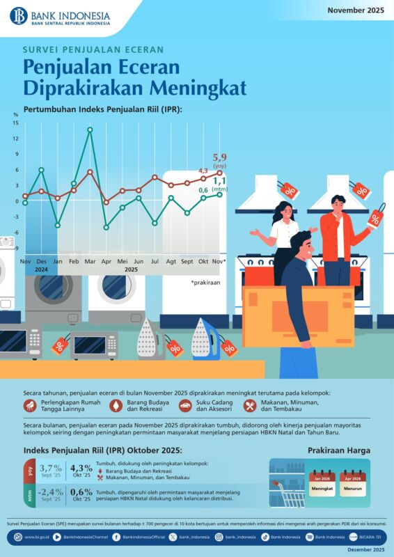 JAKARTA.NIAGA.ASIA – Kinerja penjualan eceran pada November 2025 diprakirakan meningkat. Indeks Penjualan Riil (IPR) November 2025 diprakirakan tumbuh sebesar 5,9% (yoy), lebih tinggi dibandingkan pertumbuhan pada bulan sebelumnya sebesar 4,3% (yoy).