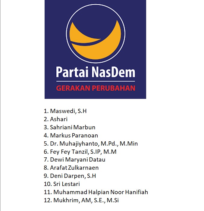 Berikut adalah daftar nama-nama bacaleg yang diajukan 17 partai peserta Pemilu di Dapil Samarinda Utara dan Sungai Pinang ke KPU Samarinda untuk diteliti dan disahkan nanti bulan Oktober sebagai caleg (tetap) untuk dipilih para pemilih, berdasarkan nomor urut partai.