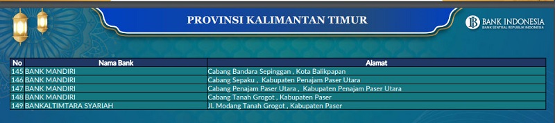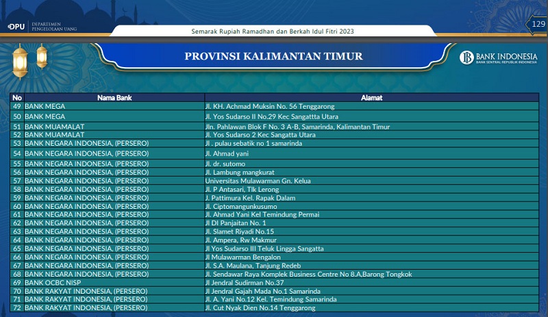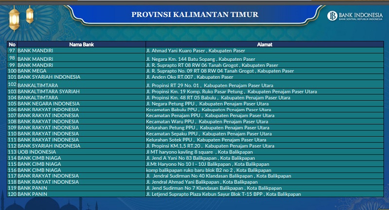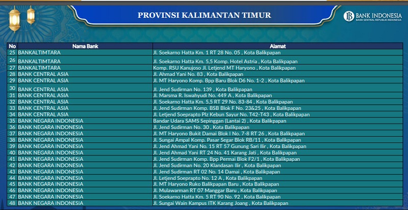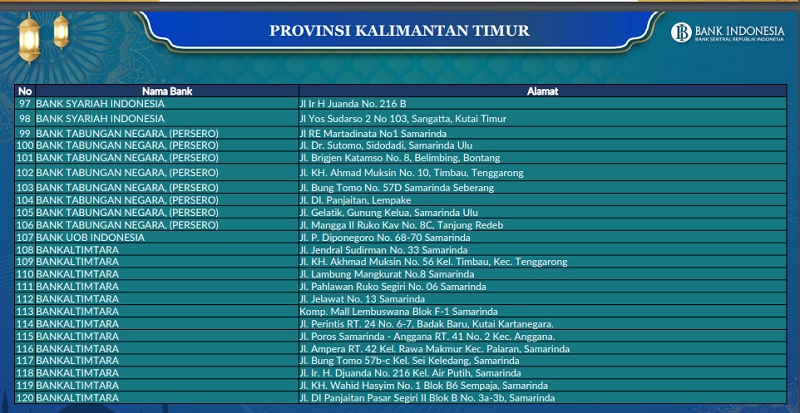Berdasarkan lampiran di program SERAMBI (Semarak Rupiah Ramadan dan Berkah Idulfitri) 2023 di Kaltim tempat penukaran uang oleh bank negara dan bank swasta tersebar di 362 titik. Sebanyak 213 ttitik berada dalam wilayah kerja Bank Indonesia Perwakilan Kaltim Kantor Samarinda dan sebanyak 149 titik berada di wilayah kerja Bank Indonesia kantor Balikpapan.