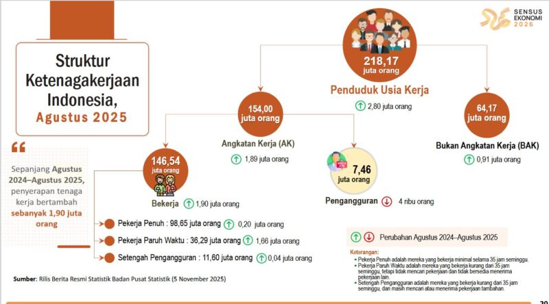 Dia menerangkan, jumlah penduduk yang masuk kategori usia kerja mencapai 218,17 juta orang per Agustus 2025. Jumlah tersebut meningkat sebanyak 2,80 juta orang jika dibandingkan Agustus 2024.