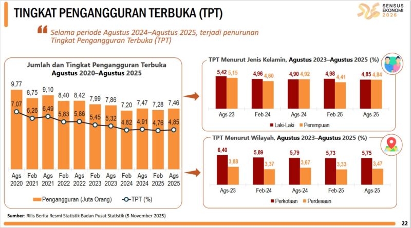 Tingkat Pengangguran Terbuka (TPT) pada Agustus 2025 sebesar 4,85 persen, turun 0,06 persen poin dibanding Agustus 2024.