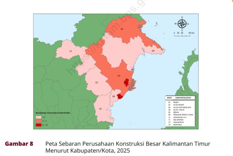 Menurut Yusniar, berdasarkan Survei Perusahaan/Usaha Konstruksi Tahun 2025, perusahaan konstruksi skala besar terkonsentrasi di Kota Samarinda dan Kota Balikpapan dengan jumlah perusahaan sebanyak 13 dan 11 perusahaan atau masing-masing sebesar 33,33 dan 28,21 persen dari total perusahaan konstruksi skala besar di Kalimantan Timur.