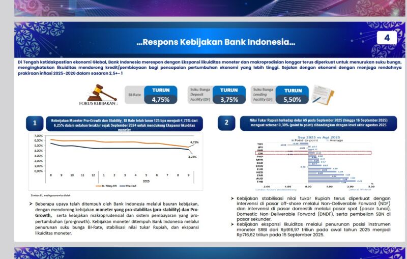 “Kebijakan stabilisasi nilai tukar Rupiah terus diperkuat dengan intervensi di pasar off-shore melalui Non-Deliverable Forward (NDF) dan intervensi di pasar domestik melalui pasar spot (pasar tunai), Domestic Non-Deliverable Forward (DNDF), serta pembelian SBN di pasar sekunder. Kebijakan ekspansi likuiditas melalui penurunan posisi instrumen moneter SRBI dari Rp916,97 triliun pada awal tahun 2025 menjadi Rp716,62 triliun pada 15 September 2025,” pungkas Budi.