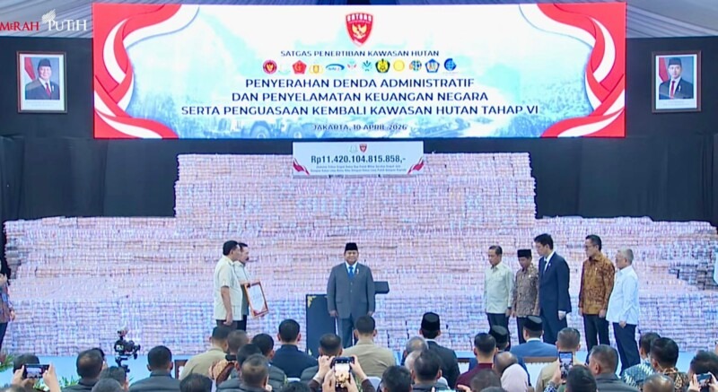 Presiden Prabowo Subianto turut hadir dalam agenda tersebut yang mencakup penyerahan denda administratif, hasil penyelamatan keuangan negara, serta penguasaan kembali kawasan hutan tahap VI.