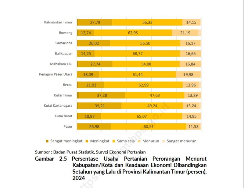 Data Survei Ekonomi Pertanian (SEP) 2024 menunjukkan bahwa 83,21% Unit Usaha Pertanian Perorangan (UTP) melaporkan kondisi ekonomi rumah tangga stagnan atau memburuk, dengan rincian: Sama Saja 56,33%, Menurun 14,15%, dan Sangat Menurun 0,95%. Hanya 28,58% yang melaporkan peningkatan.