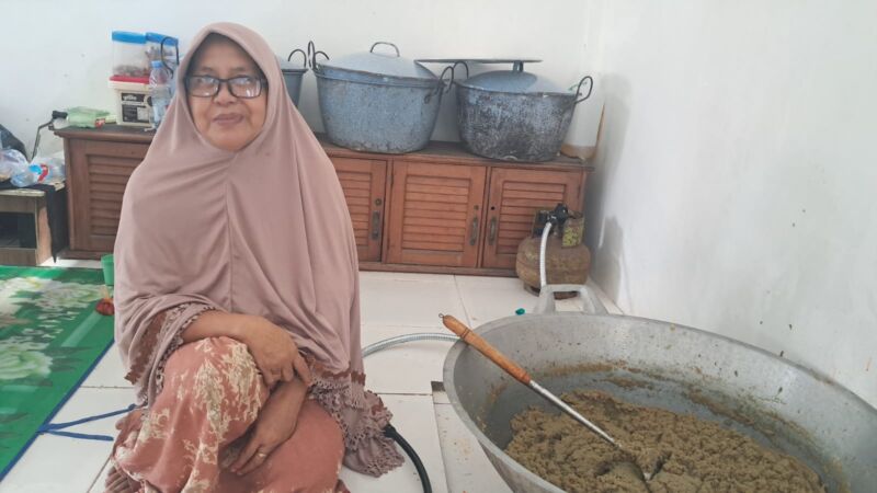 Ketua Tim Masak Bubur Peca Mardiana yang sedang memasak bumbu untuk bubur peca (niaga.asia/Nur Asih Damayanti)
