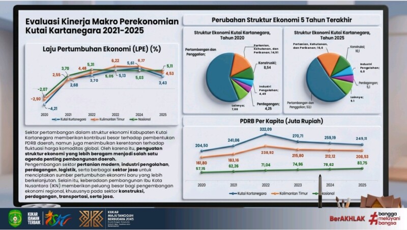 Berdasarkan data yang dipaparkan, ekonomi Kukar sempat terkontraksi pada tahun 2020 di angka -4,21 persen. Namun, pemulihan terjadi sejak 2021 dengan pertumbuhan 2,68 persen, meningkat menjadi 3,70 persen pada 2022, lalu melonjak ke 5,13 persen pada 2023 dan mencapai puncak 5,61 persen pada 2024.