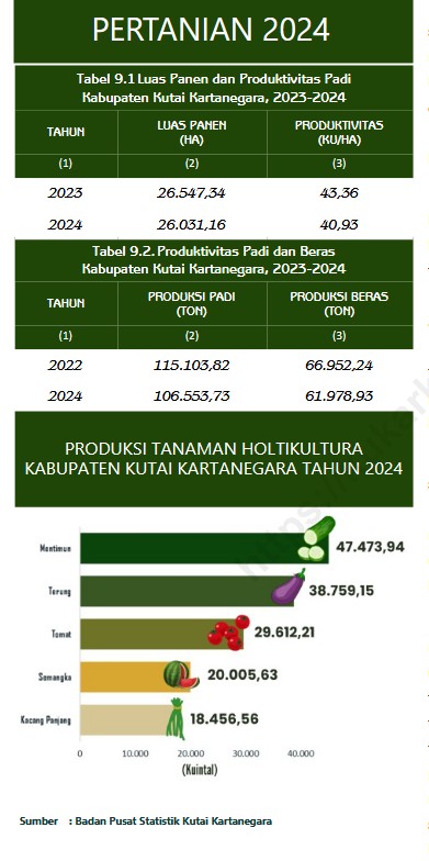 “Mayoritas usaha pertanian di Kabupaten Kutai kartanegara adalah pertanian berbasis lahan, baik lahan sawah maupun bukan sawah,” ungkap Kepala Badan Pusat Statistik (BPS) Kabupaten Kutai Kartanegara, Mursinah, SE., M.Si dalam publikasi Statistik Daerah Kabupaten Kutai Kartanegara 2024 berdasarkan data Susenas 2024 yang dipublikasikan dan sudah dapat diakses publik sejak bulan lalu, September 2025.