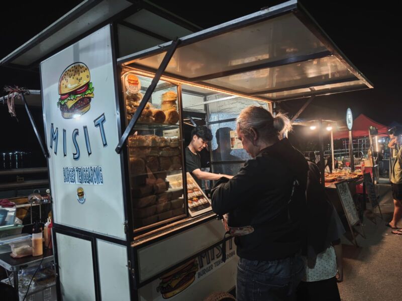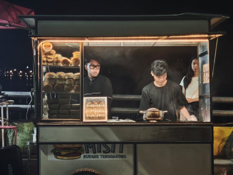 Di tengah keramaian itu, salah satu lapak yang tampak ramai diserbu pembeli adalah Misit Burger Tenggarong. Aroma roti panggang dan daging burger menyeruak dan mengundang perhatian siapa saja yang melintas.