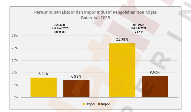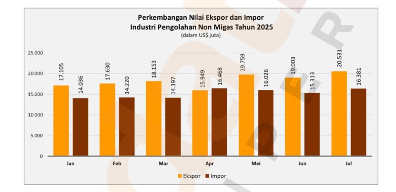 “Adapun nilai impor industri pengolahan non migas mengalami pertumbuhan sebesar 6,98% dibanding bulan sebelumnya (m-to-m) dari US$ 15,31 miliar pada Juni 2025 menjadi US$ 16,38 miliar pada Juli 2025. Jika dibandingkan dengan Juli 2024 (year-on-year), nilai impor pada bulan Juli 2025 mengalkami perftumbuhan sebesar 8,62%,” imbuhnya.