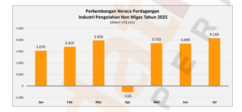 “Neraca perdagangan industri pengolahan non migas pada bulan Juli 2025 mencatatkan surplus US$ 4,15 miliar,” ungkap Juru Bicara Kementerian Perindustrian, Febri Hendri Antoni Arif dalam rilis terbarunya di di Jakarta.
