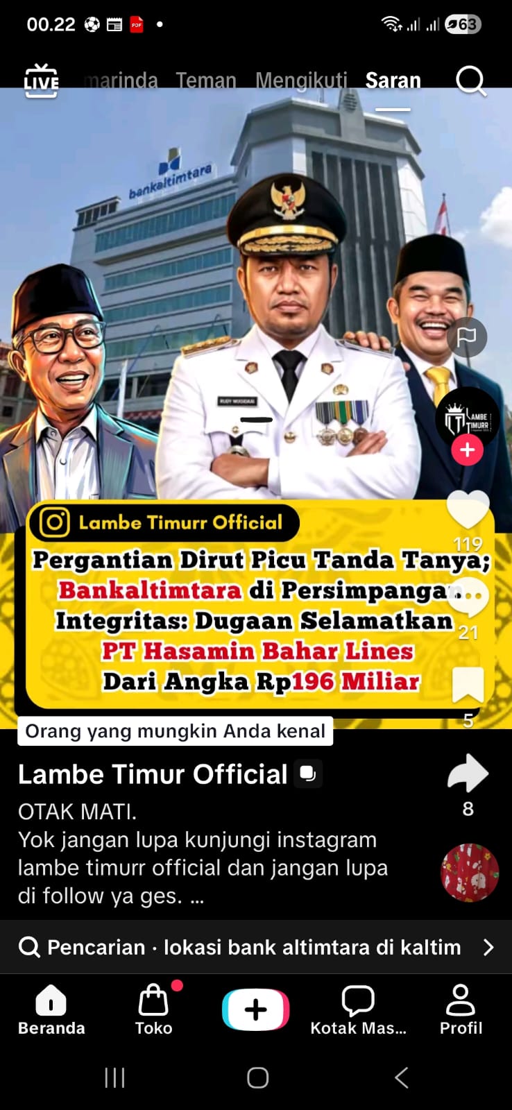 Netizen dan atau influencer yang makin usil, mengaitkan keputusan Gubernur Kaltim, Rudy Mas’ud mengganti direksi Bankaltimtara sebanyak 3 orang sekaligus, 2  orang diantaranya sebelum masa kerjanya berakhir dengan kredit macet perusahaan Hasanuddin Mas’ud yaitu PT Hasamin Bahar Line (PT BHL).