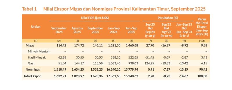 “Secara kumulatif nilai ekspor Provinsi Kalimantan Timur selama Januari–September 2025 tercatat sebesar US$15.240,62 juta, atau turun 14,67 persen dibandingkan dengan periode yang sama pada tahun 2024,” ungkap Kepala Badan Pusat Statistik (BPS) Kaltim, Dr. Yusniar Juliana dalam keterangan resminya yang disampaikan secara daring, Senin (3/11/2025).