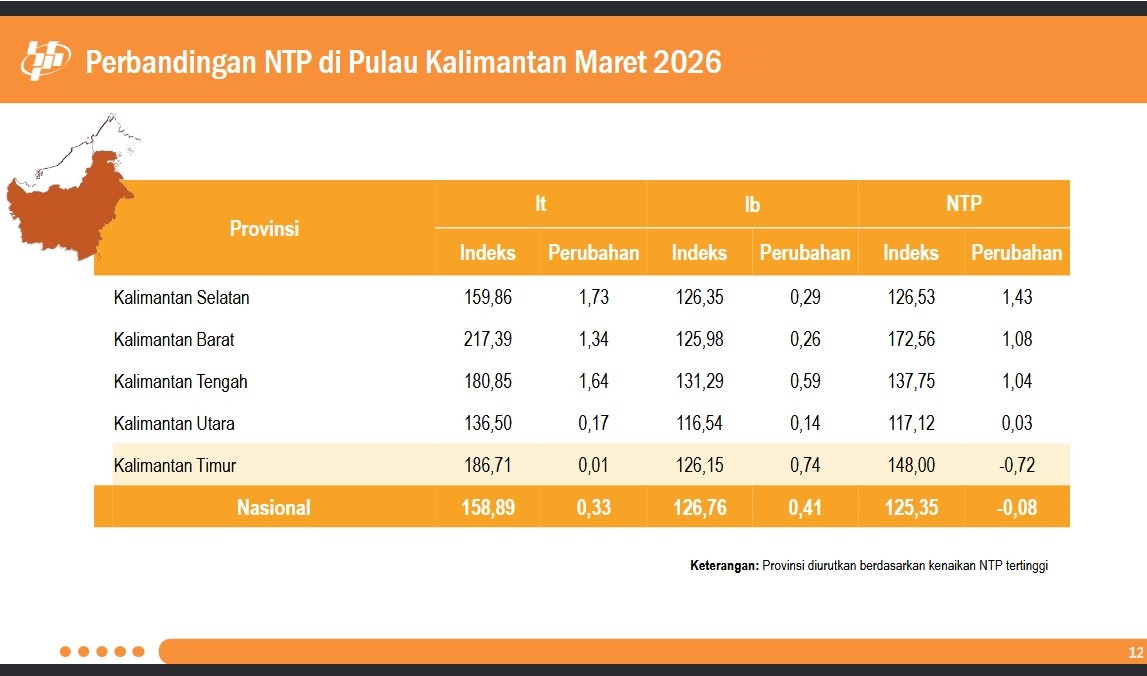 Dibandingkan NTP di Pulau kalimantan Maret 2026, NTP Kaltim yang 148.00 berada diurutan kedua setelah Kalimantan Barat sebesar 172,56. Sedangkan Kalimantan Tengah (137,75), Kalimantan Selatan (126,53), dan Kalimantan Utara 117,12.