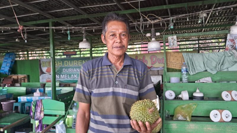 Salah satu pedagang buah durian Samsul, 60 tahun, tampak cekatan memilah durian pesanan pelanggan. Dengan parang kecil di tangan, dia mengetuk-ngetuk permukaan kulit durian, mencari suara ‘buk-buk’ yang menandakan daging buah dalamnya matang dengan sempurna.