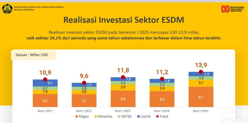 Sedangkan realisasi investasi sektor ESDM pada Semester I 2025 mencapai USD 13,9 miliar, naik sekitar 24,1% dari periode yang sama tahun sebelumnya dan terbesar dalam lima tahun terakhir.