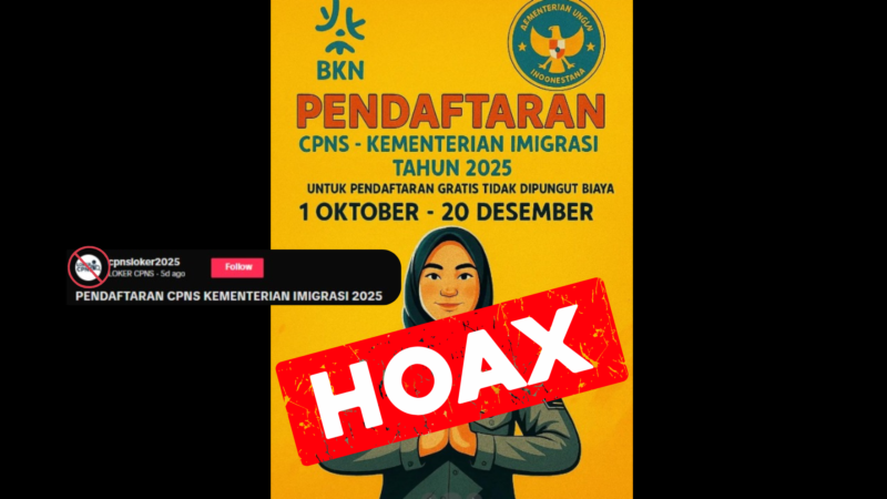 Berdasarkan penjelasan tersebut, informasi yang beredar tentang Pendaftaran CPNS Kementerian Imigrasi Tahun 2025 adalah HOAKS yang tidak dapat dipertanggungjawabkan. Setiap pihak DILARANG mengakses akun media sosial TikTok @cpnsloker2025 (https://www.tiktok.com/@cpnsloker2025/photo/7556316396595072263), termasuk TAUTAN di AKUN PROFIL TERSEBUT. Setiap informasi terkini terkait Kementerian Imigrasi dan Pemasyarakatan maupun Direktorat Jenderal Imigrasi dapat dilihat melalui situs resmi maupun seluruh kanal media sosial resmi yang telah dijelaskan sebelumnya.