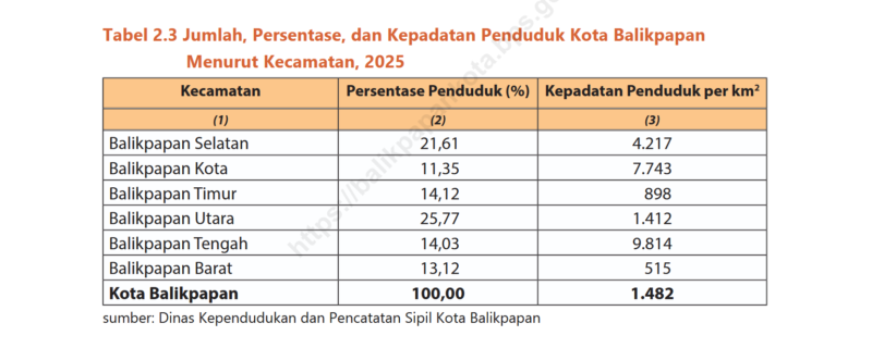 Sementara itu, kepadatan penduduk tertinggi terdapat di Kecamatan Balikpapan Tengah dengan tingkat kepadatan mencapai 9.814 jiwa per kilometer persegi, menggambarkan karakter wilayah perkotaan yang padat aktivitas ekonomi dan permukiman.