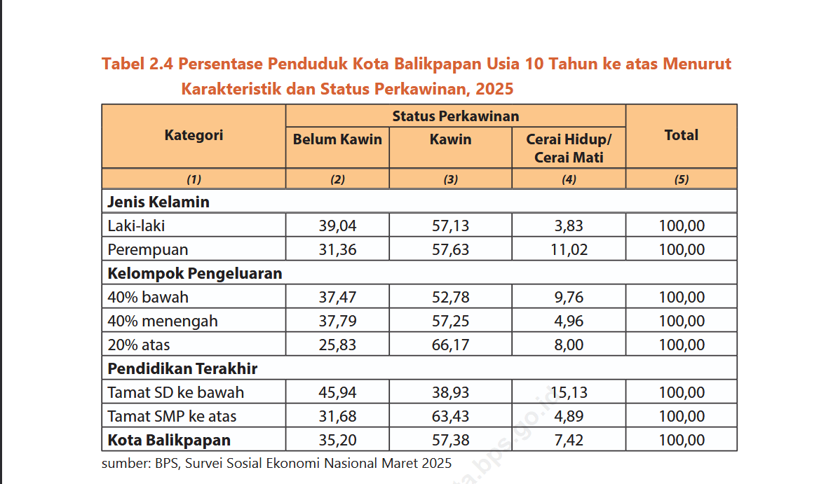 Menurut data Susenas Maret 2025, sebesar 57,38 persen penduduk Kota Balikpapan yang berusia 10 tahun ke atas berstatus kawin. Sisanya, 35,20 persen penduduk berstatus belum kawin dan 7,42 persen penduduk berstatus cerai hidup/cerai mati. Jika dirinci menurut jenis kelamin, tidak ada perbedaan yang cukup berarti untuk laki-laki dan perempuan yang berstatus kawin dan belum kawin.