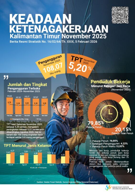 Sedangkan jumlah angkatan kerja berdasarkan Survei Angkatan Kerja Nasional (Sakernas) di Provinsi Kalimantan Timur pada November 2025 sebanyak 2.079.441 orang, naik 2.028 orang dibanding Agustus 2025. Tingkat Partisipasi Angkatan Kerja (TPAK)turun sebesar 0,50 persen poin.