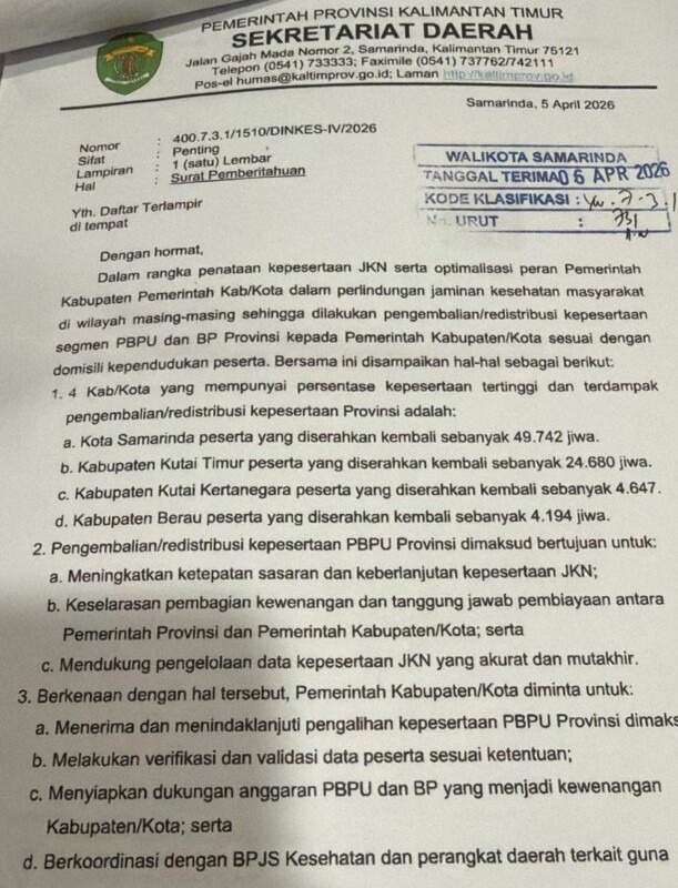 Surat edaran Sekretaris Daerah Kaltim terkait pengembalian/redistribusi kepesertaan JKN segmen PBPU dan BP Provinsi kepada kabupaten/kota sesuai dengan domisili kependudukan peserta. (Foto: Dokpim Pemkot Samarinda)