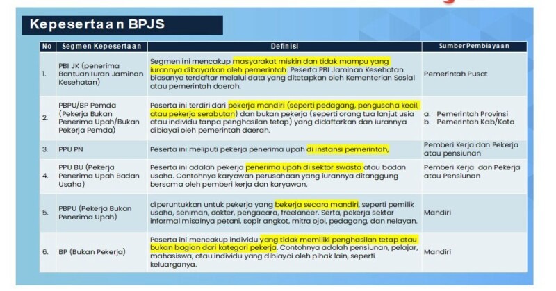 Pembagian segmen kepesertaan BPJS Kesehatan, mulai dari PBI untuk masyarakat miskin yang ditanggung pemerintah hingga PBPU bagi pekerja mandiri. (Niaga.Asia/Lydia Apriliani)