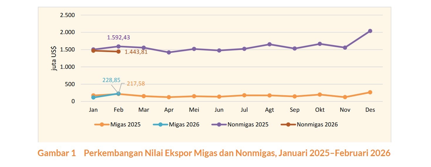 “Sebaliknya, nilai ekspor nonmigas tercatat sebesar US$1.443,81 juta, lebih rendah jika  dibandingkan dengan nilai ekspor nonmigas Januari 2026 yang tercatat sebesar US$1.469,12 juta,” ungkapnya.