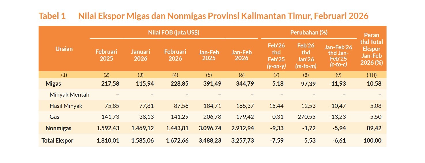 Nilai ekspor Provinsi Kalimantan Timur pada Februari 2026 tercatat US$1.672,66 juta, atau naik sebesar 5,53 persen dibandingkan dengan Januari 2026. Ekspor migas Februari 2026 tercatat sebesar US$228,85 juta, atau naik sebesar 97,39 persen dibandingkan dengan Januari 2026. Sebaliknya, ekspor nonmigas tercatat US$1.443,81 juta, atau turun sebesar 1,72 persen.