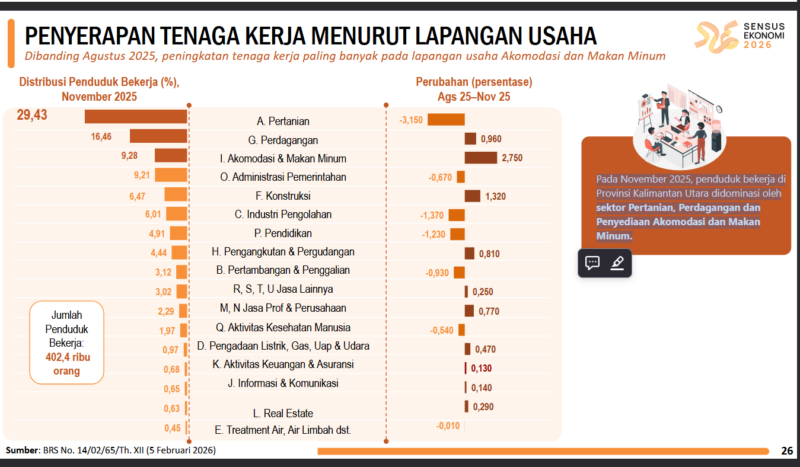 Penduduk yang bekerja di Bulan November 2025 sebanyak 402.400 orang, meningkat sebanyak 21.828 orang dari Agustus 2025. Lapangan pekerjaan yang mengalami penyerapan
