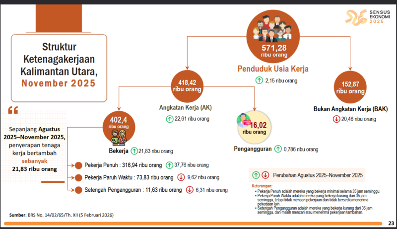 TANJUNG SELOR.NIAGA.ASIA – Sepanjang Agustus 2025 – November 2025, penyerapan tenaga kerja di Provinsi Kalimantan Utara (Kaltara) bertambah sebanyak 21.830 orang. Sedangkan Tingkat Pengangguran Terbuka (TPT) Bulan November 2025 sebanyak 16.020 orang atau 3,83 persen, atau turun -0,02 persen poin dibandingkan dengan Agustus 2025.