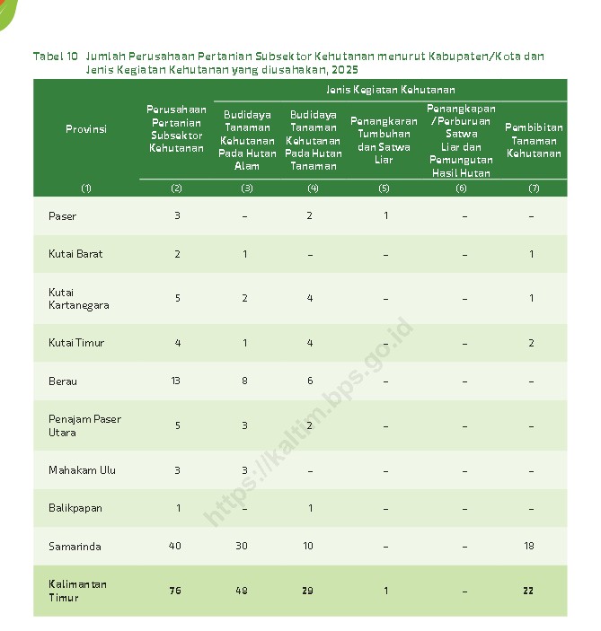 SAMARINDA.NIAGA.ASIA – Berdasarkan hasil kegiatan Updating Direktori Perusahaan Pertanian (DPP) tahun 2025, jumlah perusahaan pertanian subsektor kehutanan di Kalimantan Timur  masih cukup banyak, yakni 76 perusahaan.