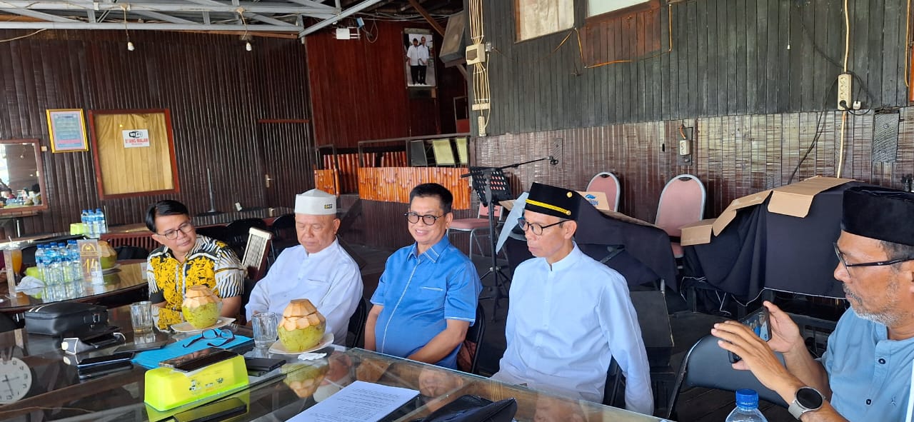 Konfrensi pers dukungan tujuh ormas daerah kepada H Rudy Mas’ud berpasangan dengan H Irianto Lambrie digelar Ketua Umum MRKB, H Mohammad Djailani dengan mengundang Tommy Pusriadi dari Yayasan Haji Rusdi Mas’ud (Harum) Center, disaksikan Ketua Umum KBBKT, H Irianto Lambrie, Sekretaris MRKB, H Zulkifli Shahab,  dan Sekretaris KBBKT, Hery Kurniawan, dilangsungkan, Jum’at (10/5/2024). (Foto Intoniswan/Niaga.Asia)