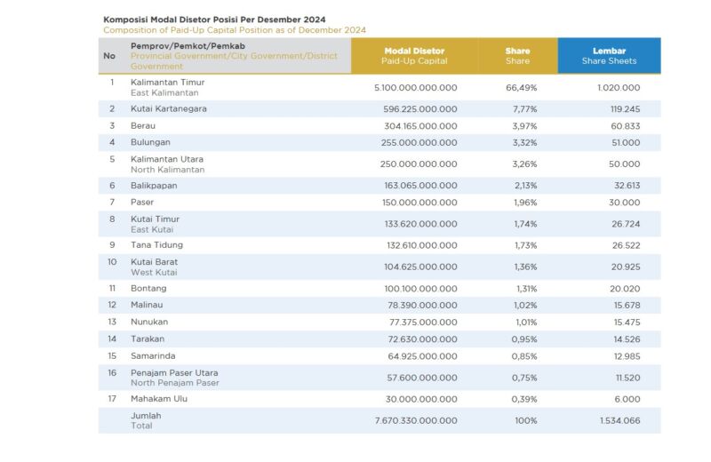 Per Desember 2024, komposisi modal disetor, kepemilikan saham Bankaltimtara terbesar yakni Pemprov Kaltim yakni Rp5,1 triliun atau setara 66,49% saham, dan kedua terbersar adala Pemkab Kutai Kartanegara Rp596 miliar atau 7,77% dari total modal Bankaltimtara,7,670 triliun.