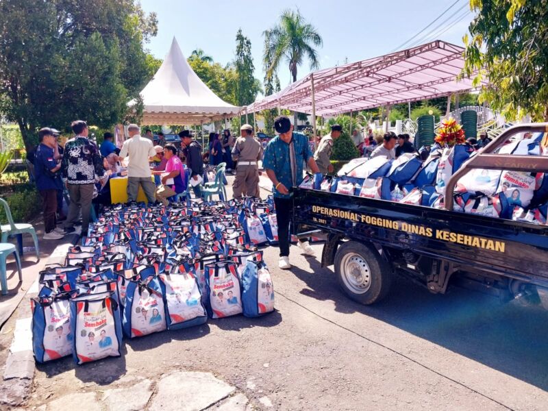 Adapun isi paket sembako berupa 2 liter minyak goreng, satu karung beras dengan berat 5 kilogram, 2 kilogram gula pasir, 1 botol sirup, 2 kaleng susu kental manis, 2 kilogram tepung terigu dan 1 goddy bag/tas buah.