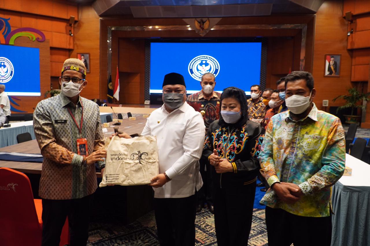 Menteri Pariwisata dan Ekonomi Kreatif, Sandiaga Uno bersama Wakil Bupati Berau, Gamalis, didampingi Ketua Tim Percepatan Pengembangan Maratua, Meiliana dan Kepala Dinas Kebudayaan dan Pariwisata Berau, Masrani di Balairung Soesilo Soedarman Gedung Sapto Pesona Jakarta, Kamis (16/12/2021). (Foto Humas Pemkab Berau)